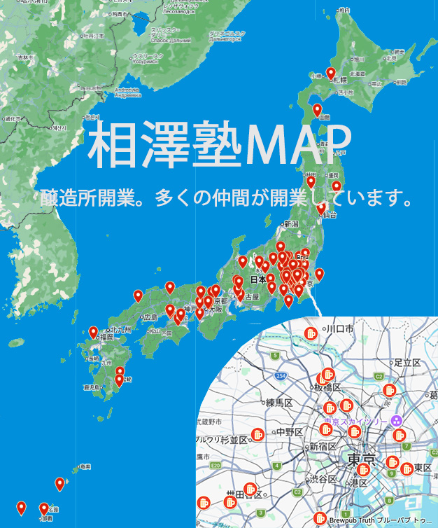 ![]() 相澤塾生が立ち上げたクラフトビール醸造所のMAP、 相澤塾生、相澤塾卒業生のみの限定公開MAPです。 熱心に醸造所立ち上げを目指す意識の高い受講生と卒業生に支えられた、内容の濃い塾です。協力し合い、助け合いながらお互いを高めあっていく。相澤塾卒業生、北海道から沖縄まで全国100ヶ所で、醸造所を立ち上げ、活躍しています。 相澤塾14期生、本日募集開始いたします。 ご応募、お待ち申し上げております。 人生は投資で決まります。投資無ければ収穫はありません。 2026.2.15 アドバンストブルーイング 相澤 相澤塾について 小規模醸造所を立ち上げたいかたを中心に、ビールを本格的に学びたいかた、ビールを自由に設計したいかたを対象とした私塾です。 基礎からの講義ですので、事前の知識は不要です。 毎回講義終了後に、軽い懇親会を開催しています。 相澤塾で一生の仲間ができる理由のひとつです。 相澤塾基本講座のゴール ・ビールを自由に設計できるようになります。 ・ビールを最良の醸造法で作れるようになります。 ・小規模醸造所やBrewPubを開設した先達や、これから開設を目指す多くの仲間ができます。 相澤塾の理念 〜クラフトマンシップ〜 クラフトビールは、アメリカのホームブルワーから始まりました。 自分でつくるとこんなに個性的な、美味しいビールができるんだ! アメリカのホームブルワーが、知恵を出し、工夫し、仲間をつくり、創ったものを自慢し、教えあって、それを真似して、より美味しいビールをつくり出していく。 40年経った今、巨大な産業に成長しました。 クラフトビールに携わる人たちの特徴は、とにかく自由、とにかくオープン。 知恵を出し、工夫し、仲間をつくり、創ったものを自慢し、教えあって、それを真似して、より良いものを創り出す。 相澤は、これがクラフトマンシップだと考えます。 こんなクラフトマンシップを持った無数の醸造家に支えられて、米国にも日本にも、今日のクラフトビール文化が存在します。 設備の規模や醸造量に関係なく、クラフトマンシップ溢れるブルワーが、誇りをもってつくるビールが、クラフトビールであると確信しています。 クラフトマンシップ、相澤塾の理念です。 ビールは自由。 度数は0〜20%、色は白濁、麦藁色、黄金色から漆黒の黒まで、 ホップの苦さはIBU(苦みの指標)0〜1000超まで、 ホップのアロマは腐葉土や枯葉を想わせるアロマから、柑橘・トロピカルアロマ、 ホップを使わない選択肢もあります。 原料も、大麦麦芽だけでなく、小麦麦芽で作っても、 フルーツやベリー類、ハーブやスパイス、野菜、根菜類を加えても良し、 発酵・熟成中に焼いた木片を加えるのも一興です。 イーストは100種類超から自由に選択。 サイダーのように炭酸を過剰に加えても、全く加えなくても、 窒素ガスを加えても大丈夫。 全てブルワーの発想次第、ビールはとにかく自由です。 ビールづくりにハンディはありません。 10Lで仕込んでも、1000Lで仕込んでも味のハンディはありません。 DIYを多用した5万円の醸造設備で仕込んでも、5000万円の設備で仕込んでも、 味のハンディはありません。 (ただし、いくつかの押さえるべきポイントを押さえれば、の条件があります) より美味しいビールを目指して、 熱中して勉強して、知恵を出し工夫して、DIYで道具を作って、とにかく自由にビールをつくる。 仲間をつくり、作った道具や創ったビールを自慢し、教えあって、それを真似して、より良いものを創り出す。 自分でつくったビールで人が笑い、喜び、幸せになる。 自分でつくったビールが人の輪をつくり、垣根やヘイトが壊れていく。 周囲や社会が楽しく豊かになっていく。 そんなクラフトマンシップ溢れるブルワーへの一歩を応援します。 オンライン開講について クラフトマンシップ溢れる同じ志を持った素敵な仲間をつくること。 相澤塾をお勧めするもう一つの大きな理由です。 コロナ下、オンライン開講のお問い合わせが増えています。 「人間同士が真の信頼関係を築くには視覚と聴覚の共有だけでは担保されない。 五感全て(+味覚、臭覚、触角)をつかってこそ信頼をかたちづくることができる」。 人類学者、霊長類学者 山極壽一先生の知見ですが、相澤もそのように確信しています。 この理由から、相澤塾のオンライン開講は検討しておりません。 2021.06.01 アドバンストブルーイング 相澤